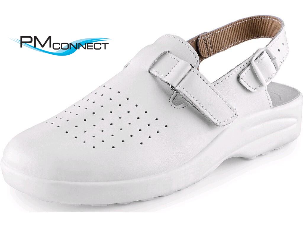 Sandál, dámský, kožený s plnou špicí, perforovaný s přezkou na suchý zip a páskem kolem paty. Materiál: svršek z přírodní úsně, antistatická, protiskluzová PU podešev.Doplňkové parametry