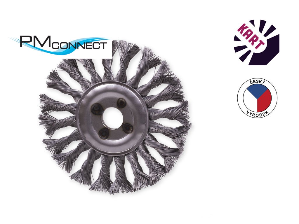 Radiální copánkový kartáč s rovnými konci, o průměru 150 mm, osazený hladkým ocelovým drátem o průměru 0,40 mm, s upínacím otvorem o průměru 22,2 mm.