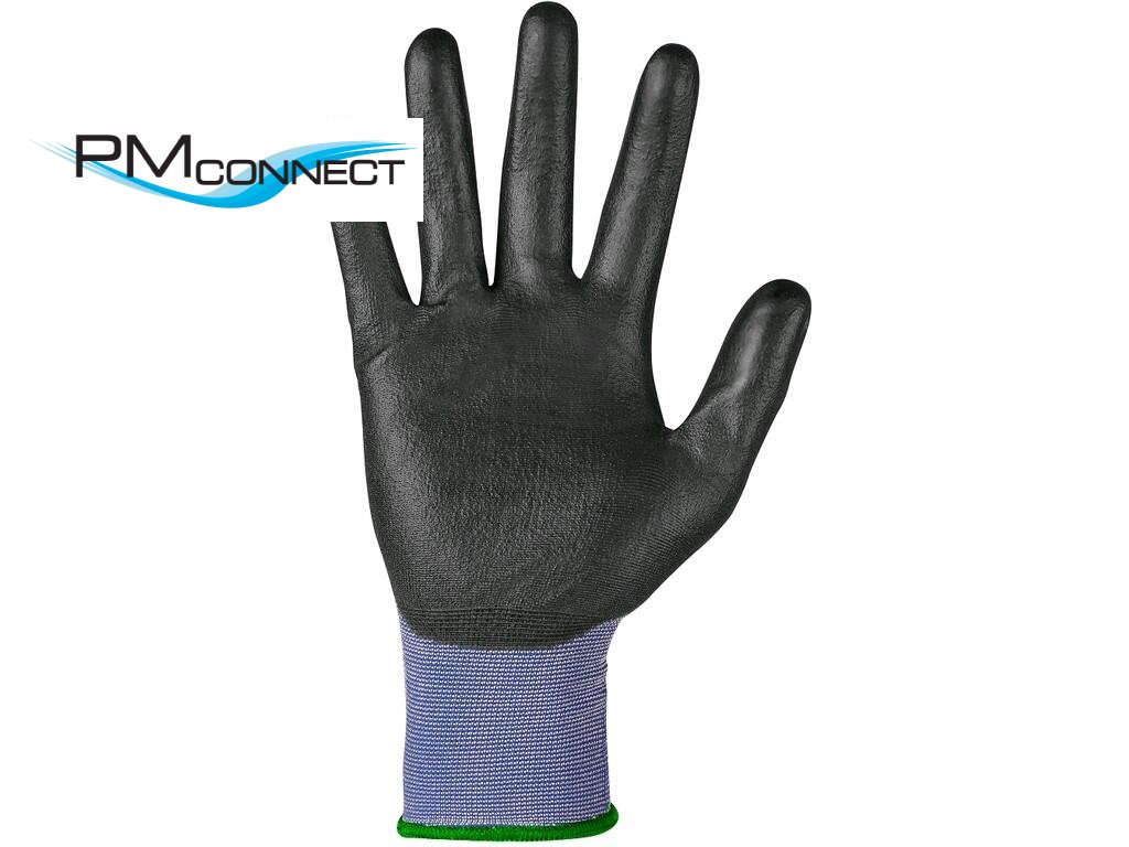 Pletené bezešvé rukavice s pružnou manžetou, dlaně a prsty povrstveny polyuretanem. Hustota tkaní 18 G pro větší flexibilitu a citlivost. Doporučené aplikace: automobilový průmysl, elektronika, logistika, skladování, lehké montáže.Doplňkové parametry