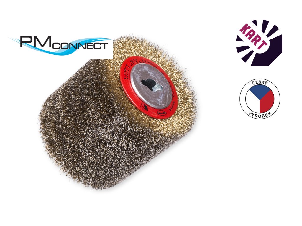 Drátěný válcový kartáč 100 x 120 x 12,9 mm [průměr x délka x upínací otvor], osazený vlnitým ocelovým pomosazeným drátem o průměru 0,30 mm.