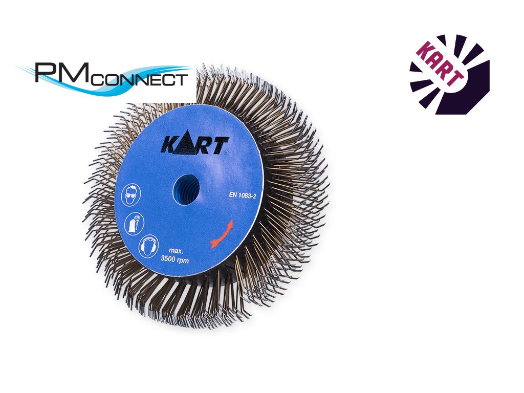Agresivní kotoučový kartáč o průměru 100 mm osazený ocelovým kaleným drátem s nabroušenými hroty o průměru 0,60 mm s upínacím otvorem M14.