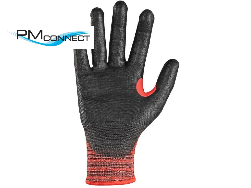 Protiřezné ESD rukavice s odolností proti řezu F a antistatickými a ESD vlastnostmi. Vnitřní odpor – výsledek: Rv<1,0 x 108 Ω. Dlaň a prsty povrstveny polyuretanem. Podklad tvoří bezešvý úplet bez obsahu skelných nebo ocelových vláken. Funkce Touchscreen (možnost ovládat dotykové obrazovky) je podmíněna volbou vhodné velikosti rukavice. Rukavice jsou pratelné, čímž snižují spotřebu a tím vznik odpadu. Neobsahují silikon. Doporučené aplikace: EPA prostory, elektrotechnický průmysl, obsluha CNC strojů a robotů, logistika, skladování, manipulace s tabulovým sklem a předměty s ostrými hranami, manipulace s tabulovým plechem, řezání suchých, lakovaných nebo galvanizovaných dílů, řezání malých, suchých nebo lehce zaolejovaných dílů, údržba.