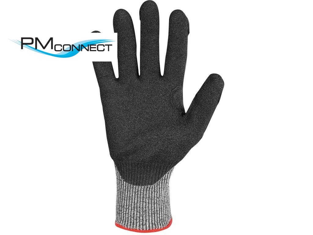 Protipořezové rukavice s odolností proti řezu D a protinárazovou TRP ochranou kloubů (P). Dlaň a prsty povrstveny nitrilem s pískovou úpravou pro lepší úchop. Podklad tvoří pletený bezešvý úplet s pružnou manžetou. Funkce Touchscreen (možnost ovládat dotykové obrazovky) je podmíněna volbou vhodné velikosti rukavice. Neobsahují silikon. Doporučené aplikace: logistika, skladování, manipulace s tabulovým sklem a předměty s ostrými hranami, manipulace s tabulovým plechem, řezání suchých, lakovaných nebo galvanizovaných dílů, řezání malých, suchých nebo lehce zaolejovaných dílů, práce vyžadující ochranu proti nárazu, údržba.