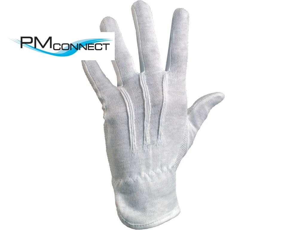 Textilní šité rukavice z běleného bavlněného úpletu, střih fourchette, dlaň a prsty pokryty drobnými PVC terčíky, gumička v zápěstí. Doporučené aplikace: skladování, manipulace s lehkým a drobným materiálem, jemná montáž.Doplňkové parametry