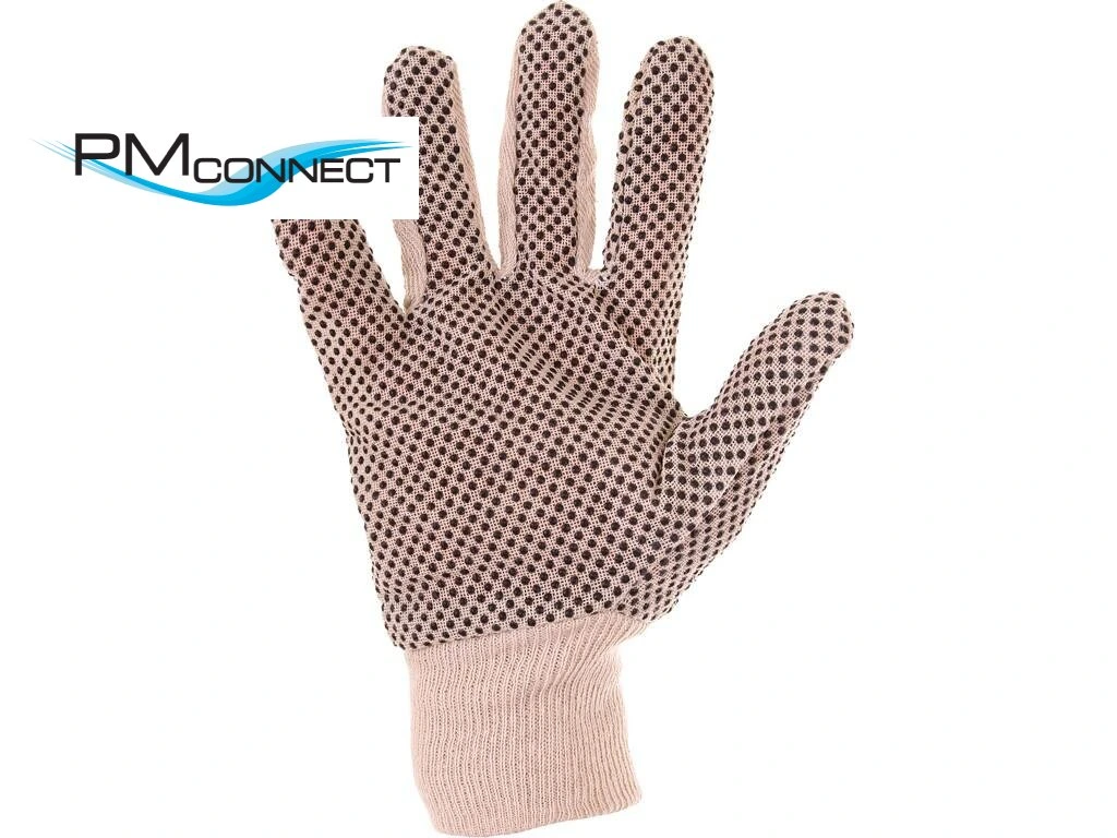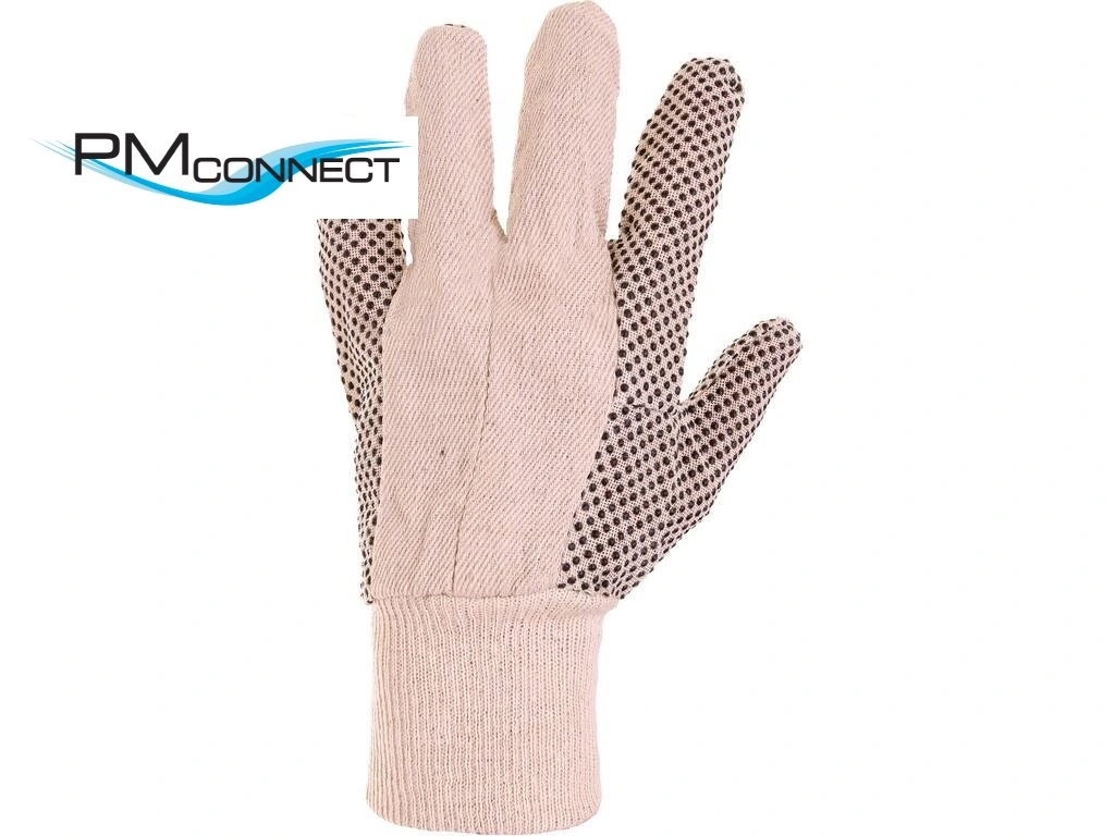 Textilní rukavice šité z bavlněného plátna, dlaň a prsty pokryty PVC terčíky, pružná manžeta. Doporučené aplikace: logistika, skladování, hobby, lehká montáž, zemědělství, zahrada.Doplňkové parametry