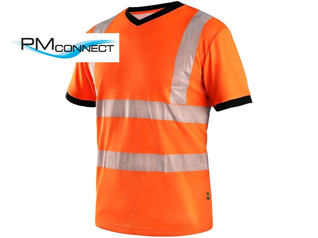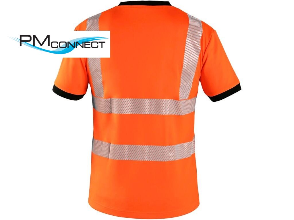 Výstražné tričko s krátkým rukávem, kontrastní olemování kolem krku a rukávů v černé barvě, průkrčník do V, zpevňující krční páska, postranní švy, větrání v podpaží, segmentované reflexní pruhy: 2 horizontální, 2 vertikální (šíře 5 cm). Doporučené použití: stavebnictví, silničáři, řidiči, logistika, údržba, kolo, motorky, skladování.Doplňkové parametry