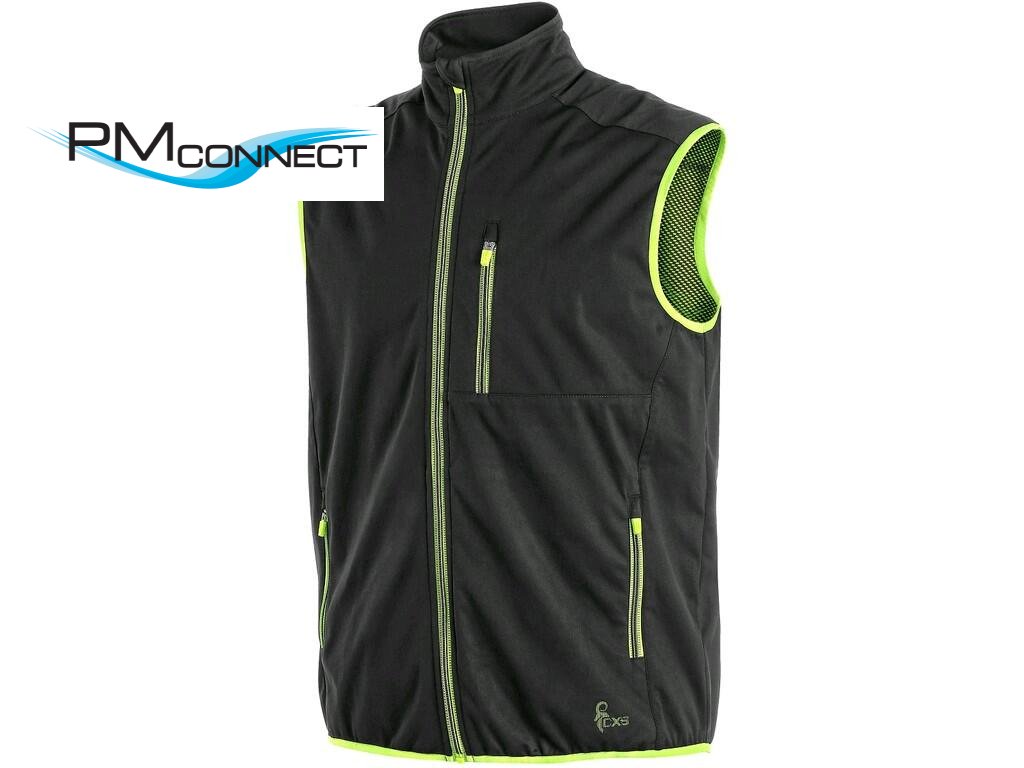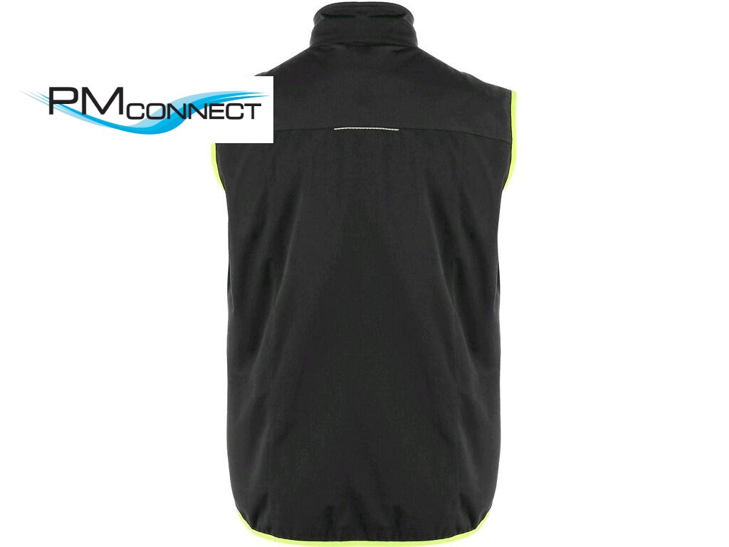 Lehká softshellová propínací vesta s reflexními výpustky, bez TPU, spodní lem do gumičky, 3 venkovní kapsy na zip a 3 vnitřní kapsy, dvoubarevné zipy.