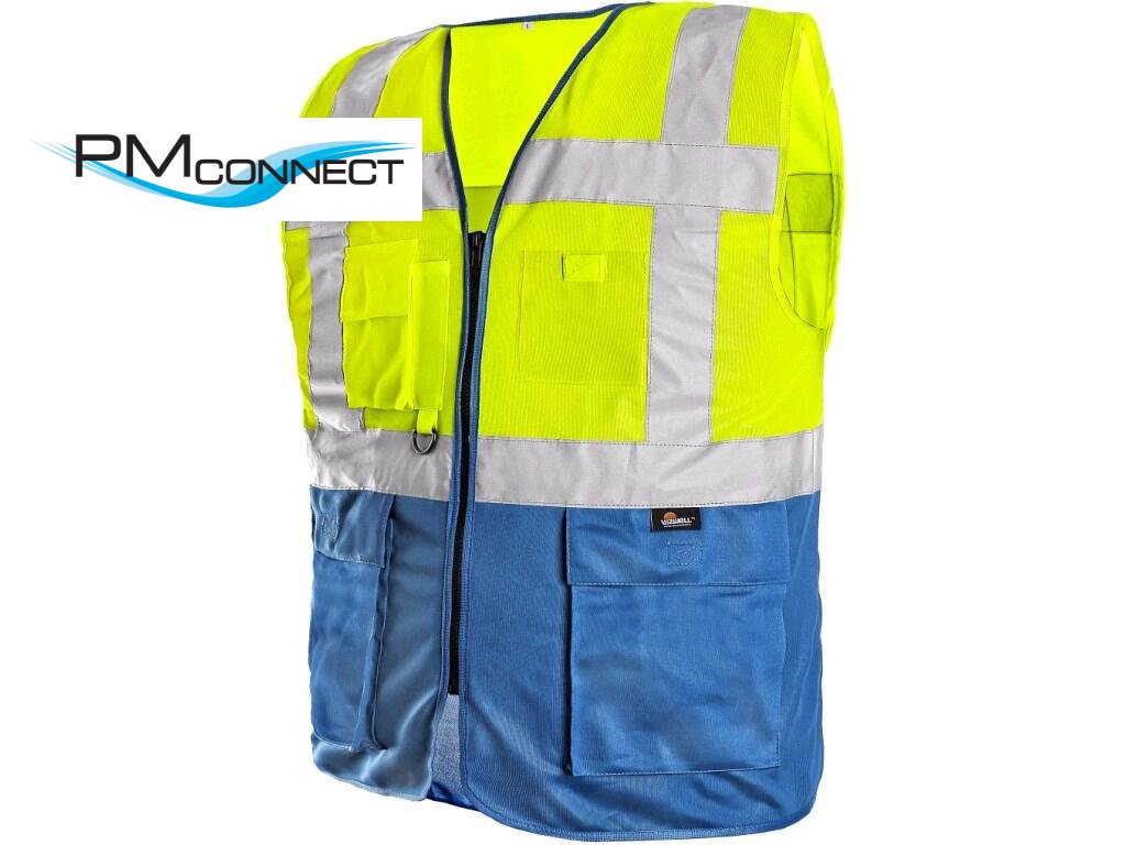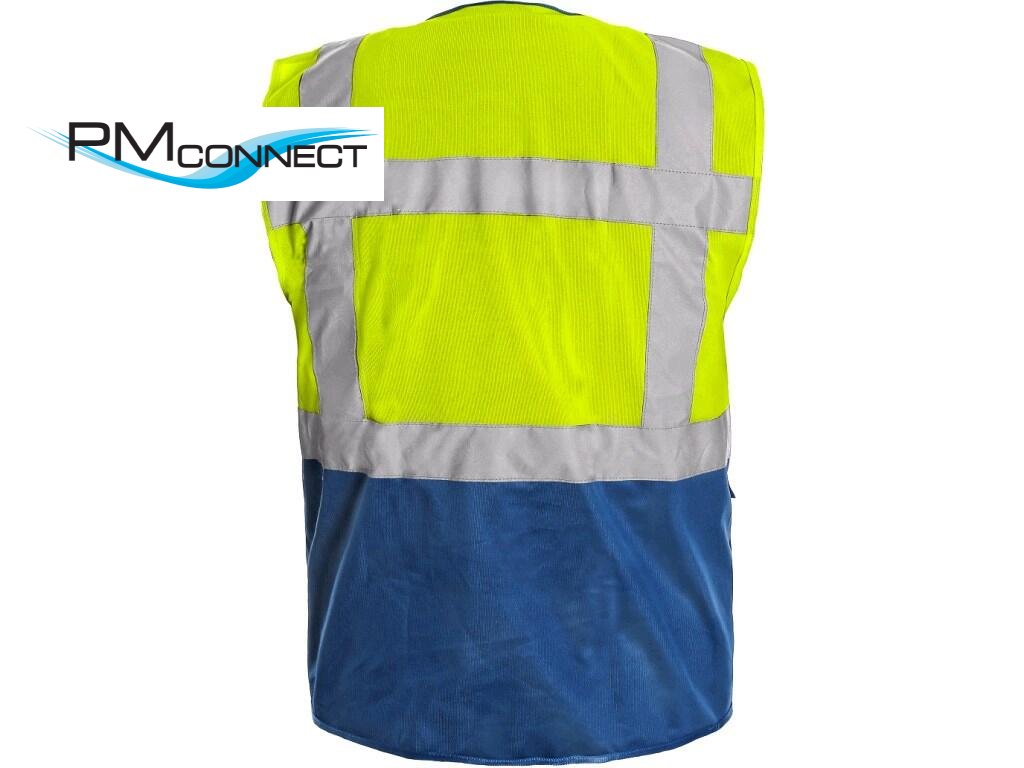 Dvoubarevná výstražná vesta se zapínáním na zip, 2 spodní kapsy kryté patkou, vpravo nahoře kapsa na mobil a tužku, kroužek na přichycení ID karty, vlevo nahoře průhledná kapsička na ID kartu, reflexní pásky kolem těla i přes ramena. Moderní a víceučelový design zajišťuje bezpečnost, pohodlí i praktičnost. Spodní modrá část vesty chrání vestu, aby bylo znečištění méně viditelné.Doplňkové parametry